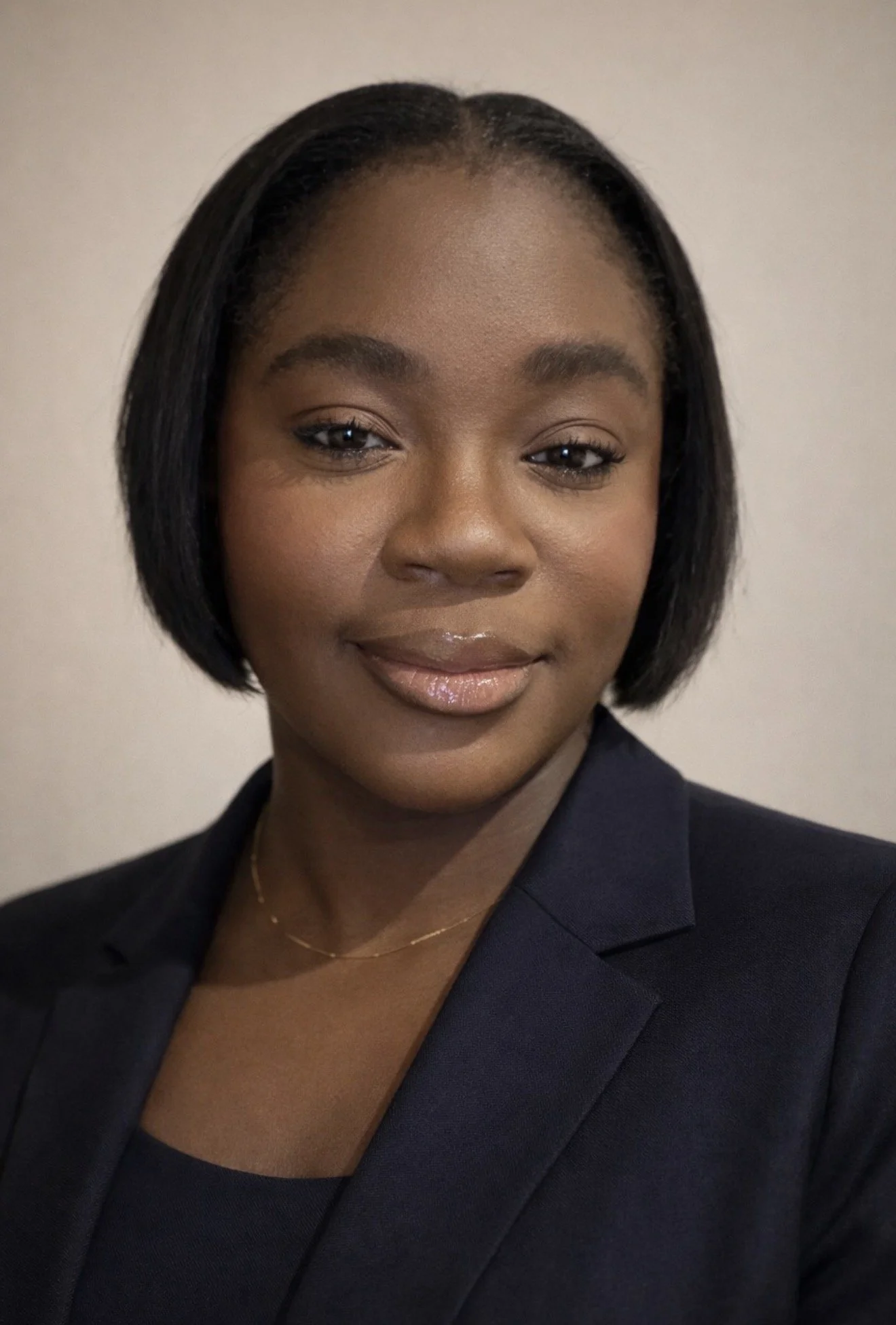 Hair neatly styled and professional, smooth finish, natural hairline preserved. Wardrobe elevated and realistic, structured blazer or elegant top in a neutral or jewel tone, professional and understated, minimal jewellery.